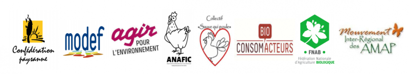 [1]Confédération paysanne, Modef*, FNAB, ANAFIC, Sauve qui poule, Agir pour l'environnement (APE*), Bio Consom'acteurs, Miramap.