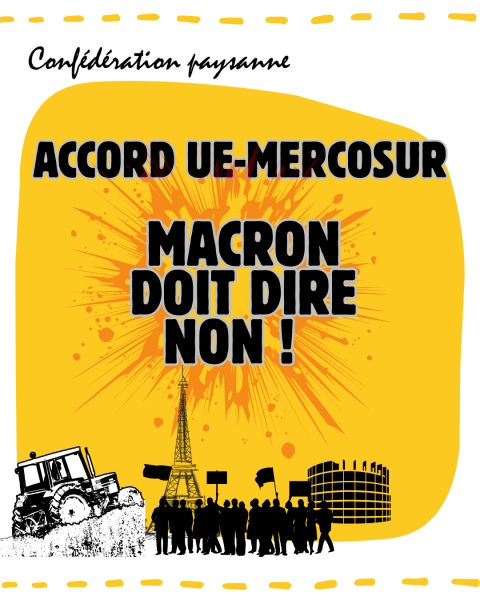 En attendant, la Confédération paysanne annonce qu'elle ne participera pas aux conférences de la souveraineté alimentaire tant que la France n'annoncera pas son rejet pur et simple de cet accord. Il est impossible de débattre de souveraineté alimentaire avec des acteurs qui soutiennent un accord qui porte atteinte à la souveraine alimentaire ici en Europe et dans les pays du Sud, dont ceux du Mercosur*.