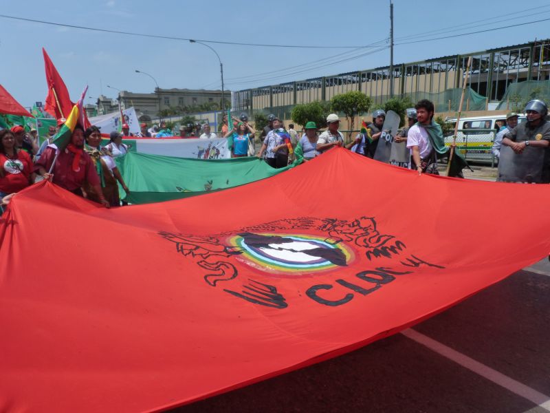 Le mercredi 10 décembre, c'est le jour de la marche pour la défense de la Terre Mère, la Pachamama des Amérindiens. Plus de 20 000 personnes se mobilisent dans les rues de Lima sous de multiples bannières. Une importante représentation de syndicats de travailleurs et d'organisations paysannes en début de marche prouve qu'ils sont le moteur du changement et la force la plus puissante pour renverser la tendance. Les organisations de femmes sont aussi très présentes et revendiquent haut et fort leur reconnaissance dans le processus de changement, car souvent pilier indispensable de la société, notamment dans les communautés rurales.